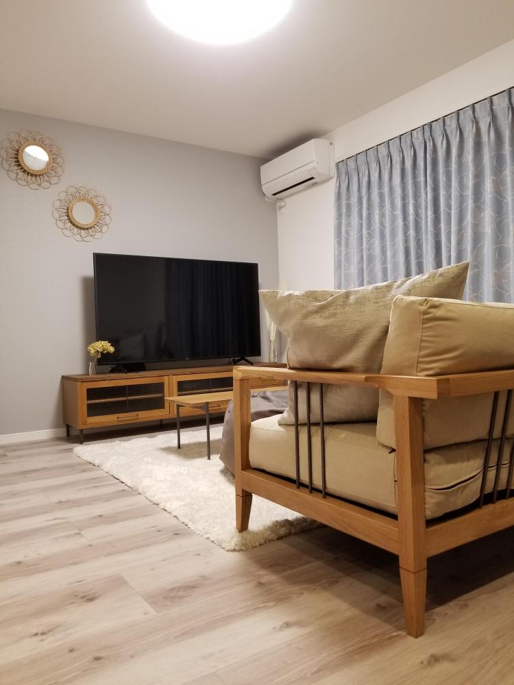 グレーとブルーの淡色系でまとめつつ、インテリアでアイアン素材をアクセントとして採用。