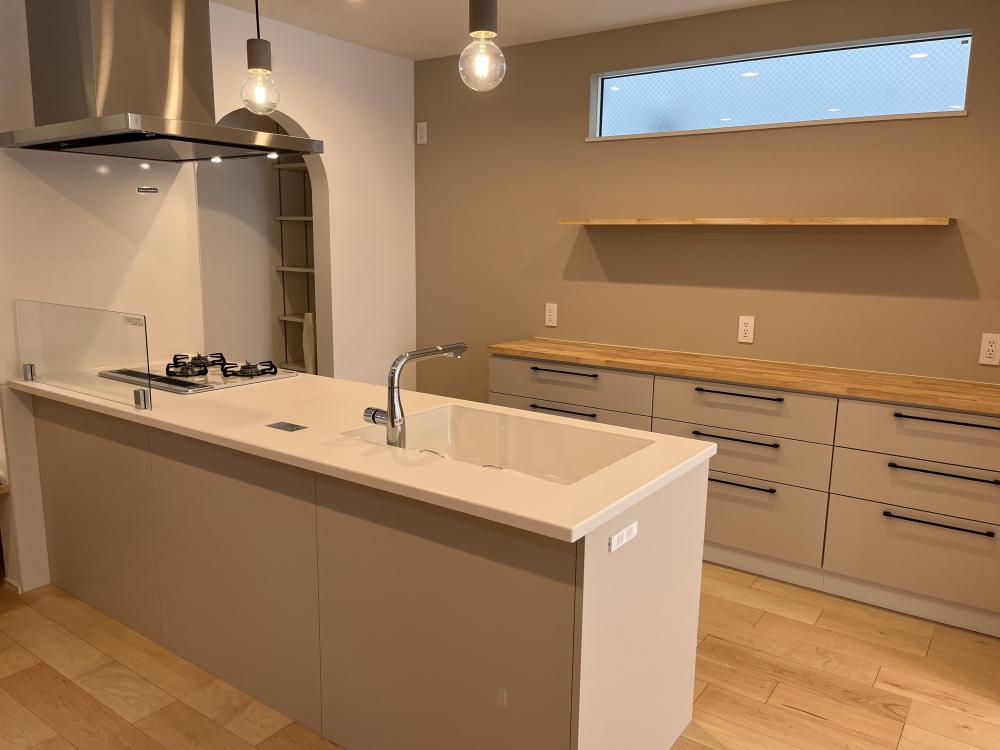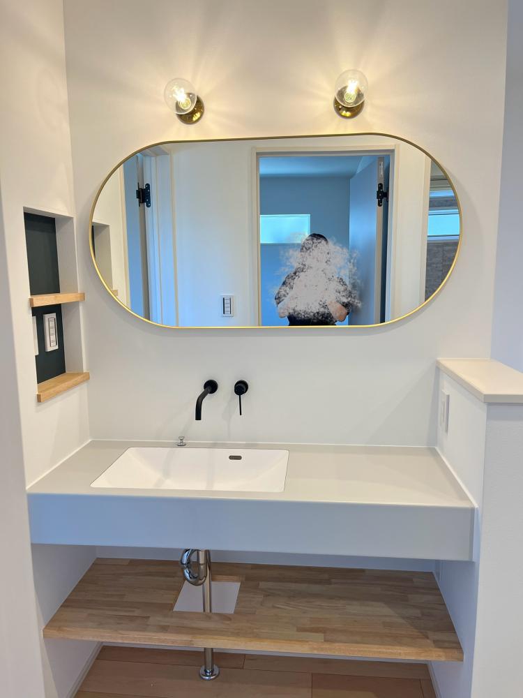 白を基調に明るいカラーの木とベージュの落ち着いたカラーを取り入れてナチュラルなお家を目指しました。アクセントに黒やグリーン、ゴールドも少し使っています。