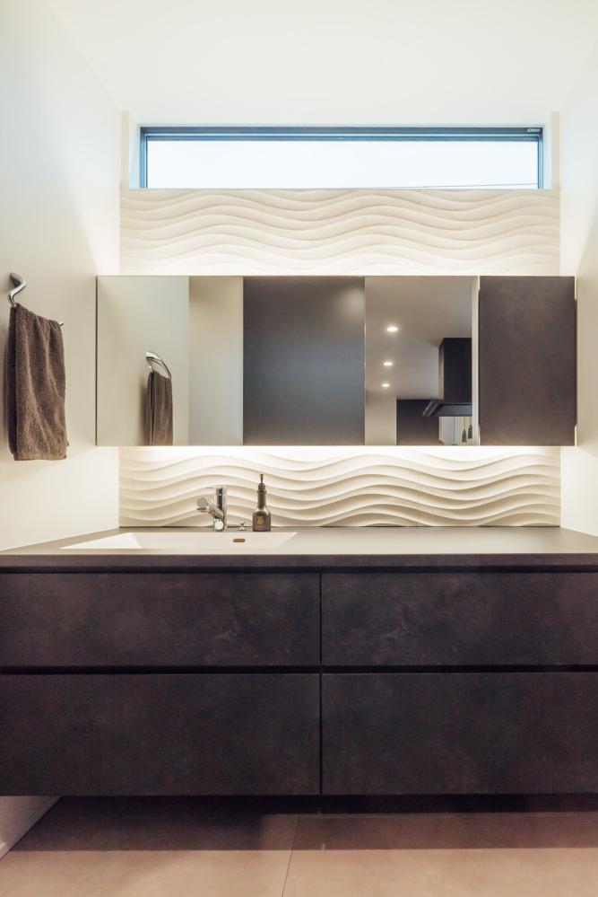 建具もフルハイトドアですっきりさせて、アクセントでタイルを壁の仕上げに使用しております。