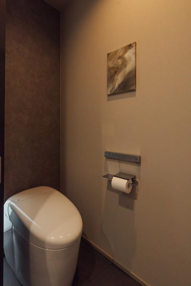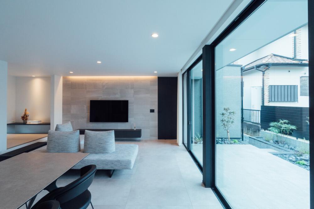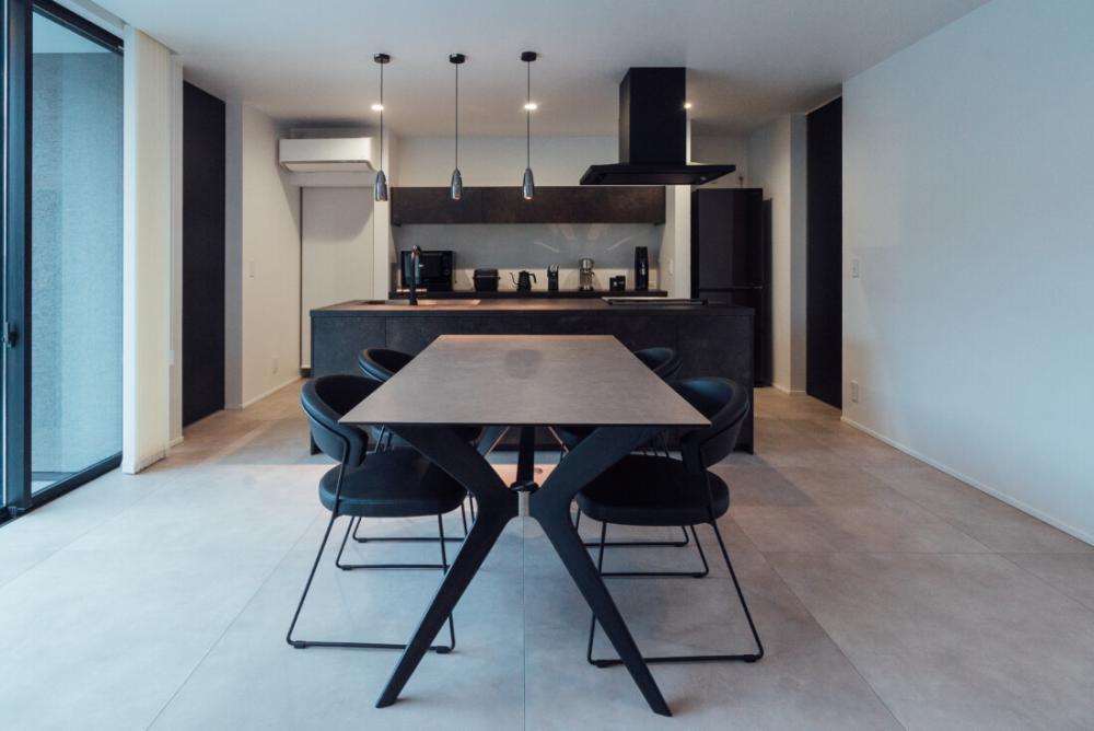 中はホテルライクを基調に、床はマットなモルタル調のフロアタイルで仕上げました。