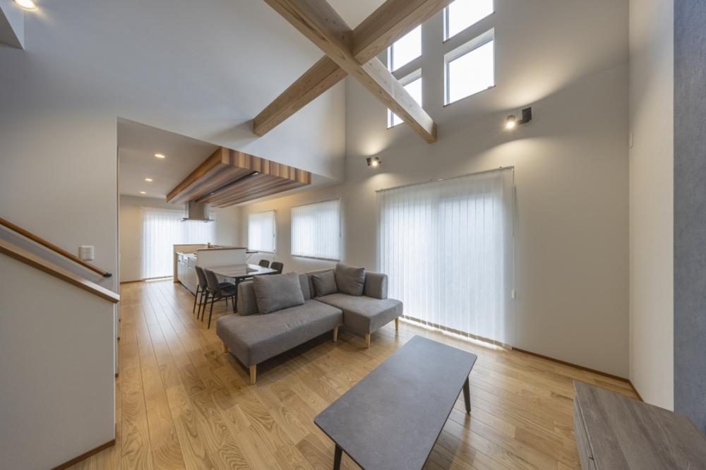 梁を見せた吹き抜けのリビングは、空の広がりと木の力強さを感じる心地よい空間。