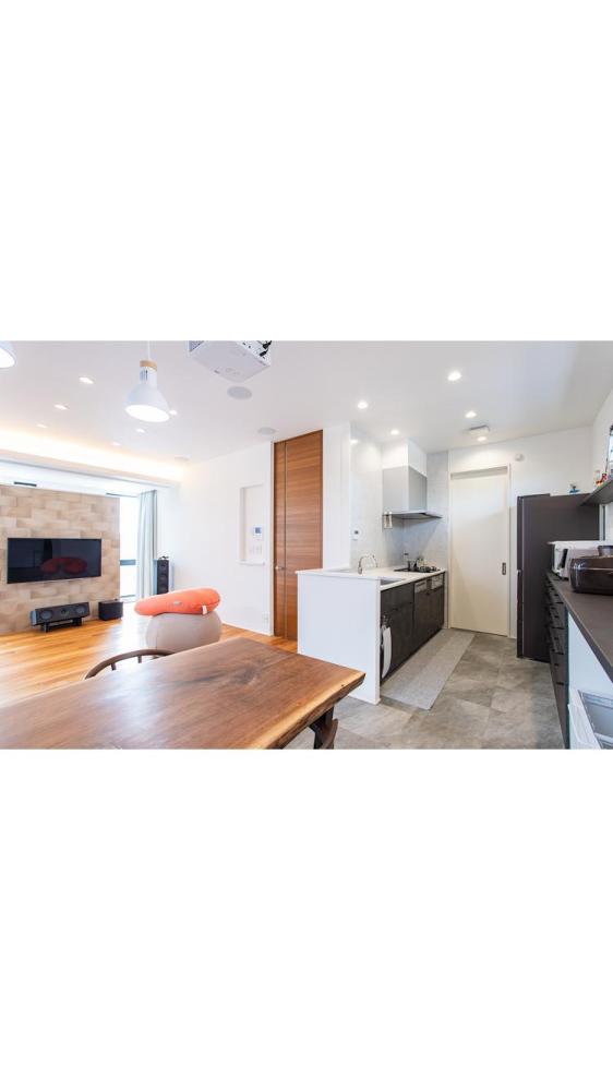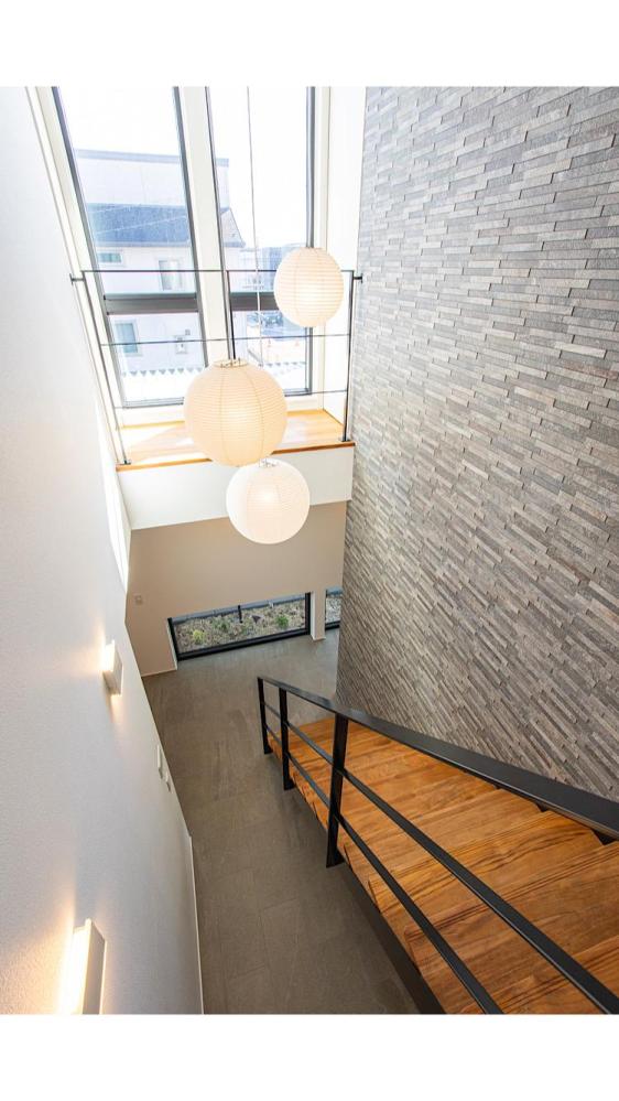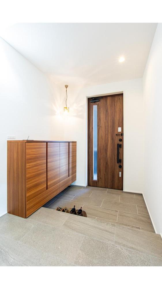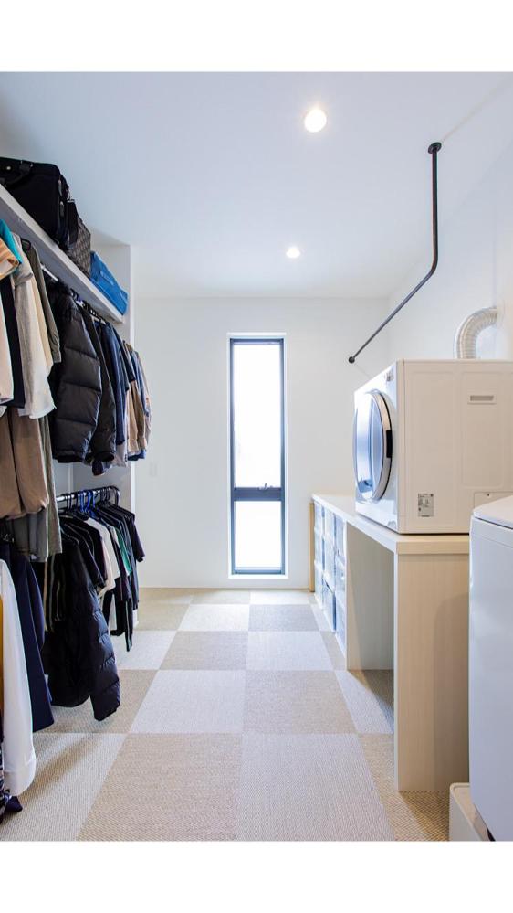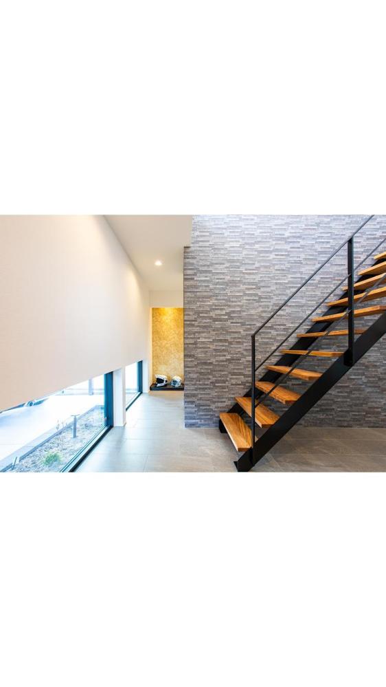 玄関入ってからの開放感を重視しスケルトン階段と吹抜けを採用し階段の幅は通常仕様より10cm広くしている。1階の廊下はタイル、階段と2階にはチークの無垢材を採用し、キッチンやユーティリティには水に強いフロアタイルを採用することで実用性を高めた。ユーティリティでは洗面、脱衣、洗濯、クローゼットを集約しひと部屋で完結できるようにした。トレーニングルームは耐荷重を上げるため床を支える部品を増やして対応。