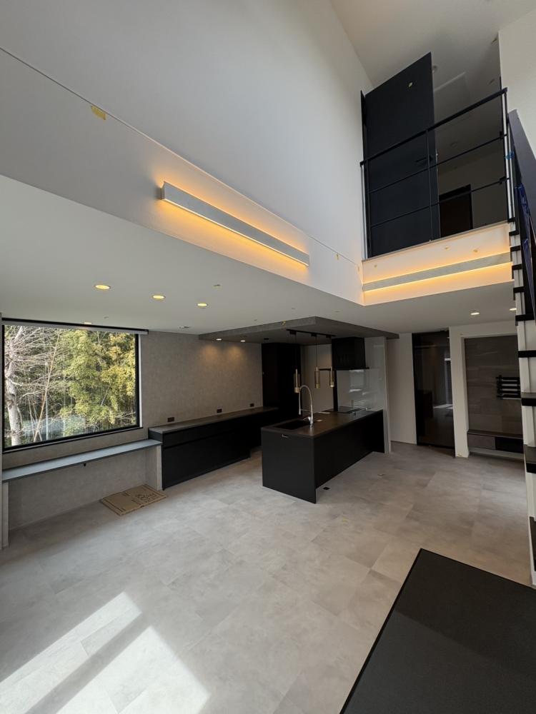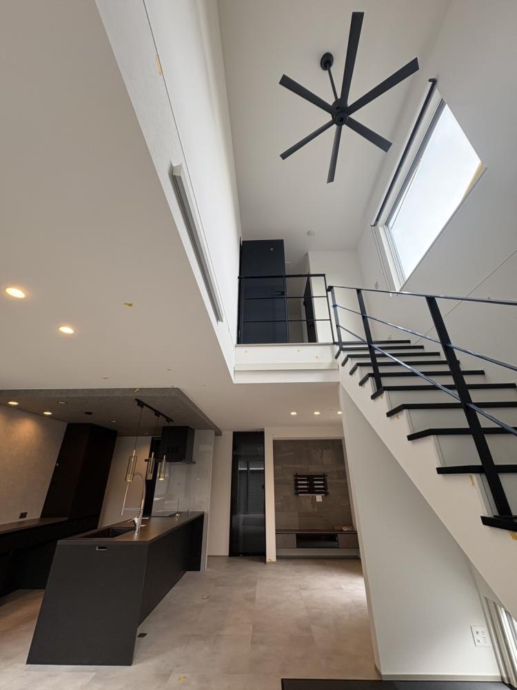 隣家を気にすることなく海に向かって開けた吹抜け空間のある開放感溢れるリビング