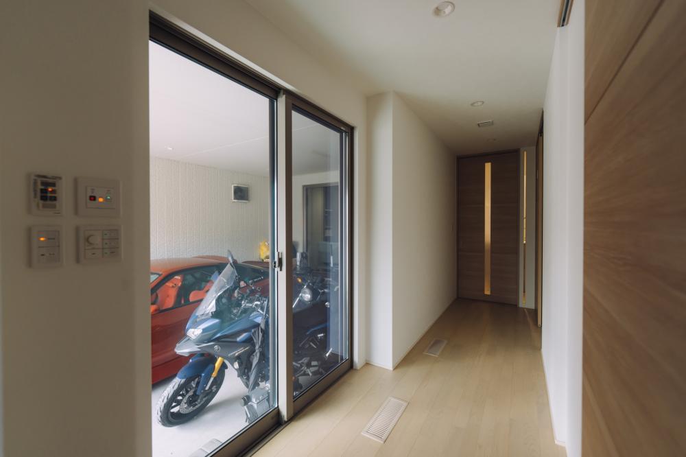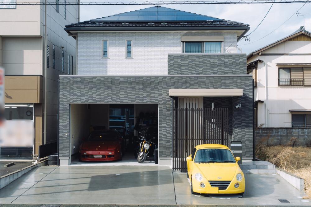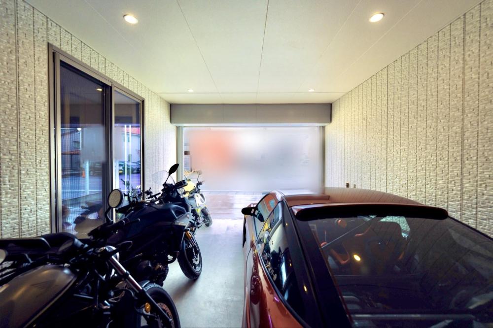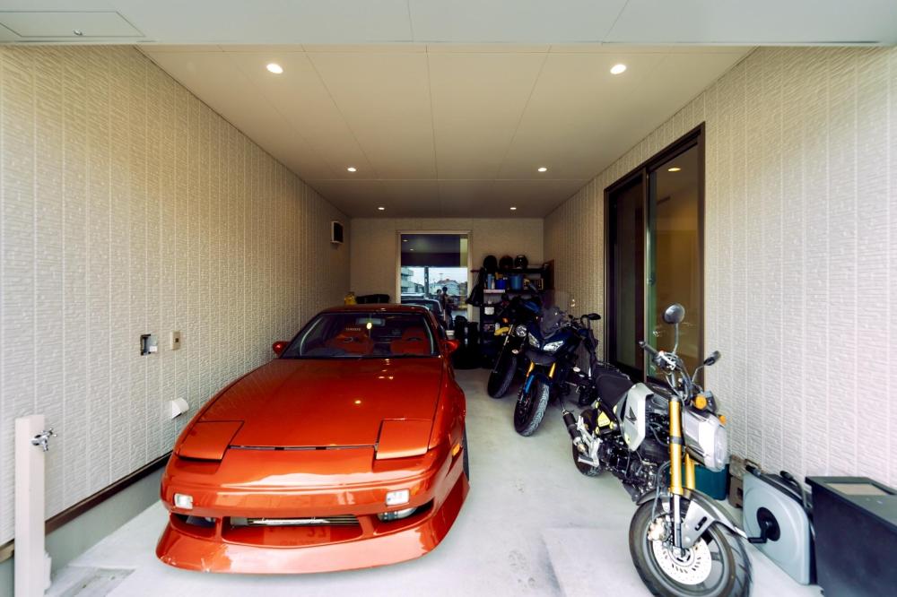 #インナーガレージ、#ガレージ、#車、#バイク、#吹抜け、#タイル外壁、#ワークスペース、#スケルトン階段、#キッチンハウス、#Ⅱ型キッチン#全館空調、#室内干し、#バルコニー、#将来間仕切り