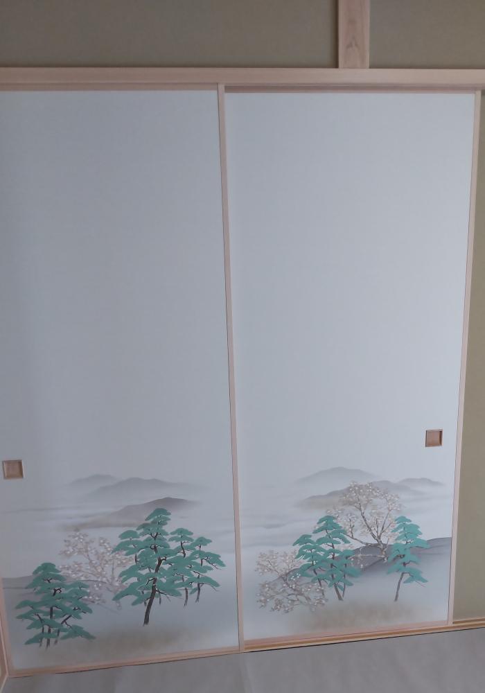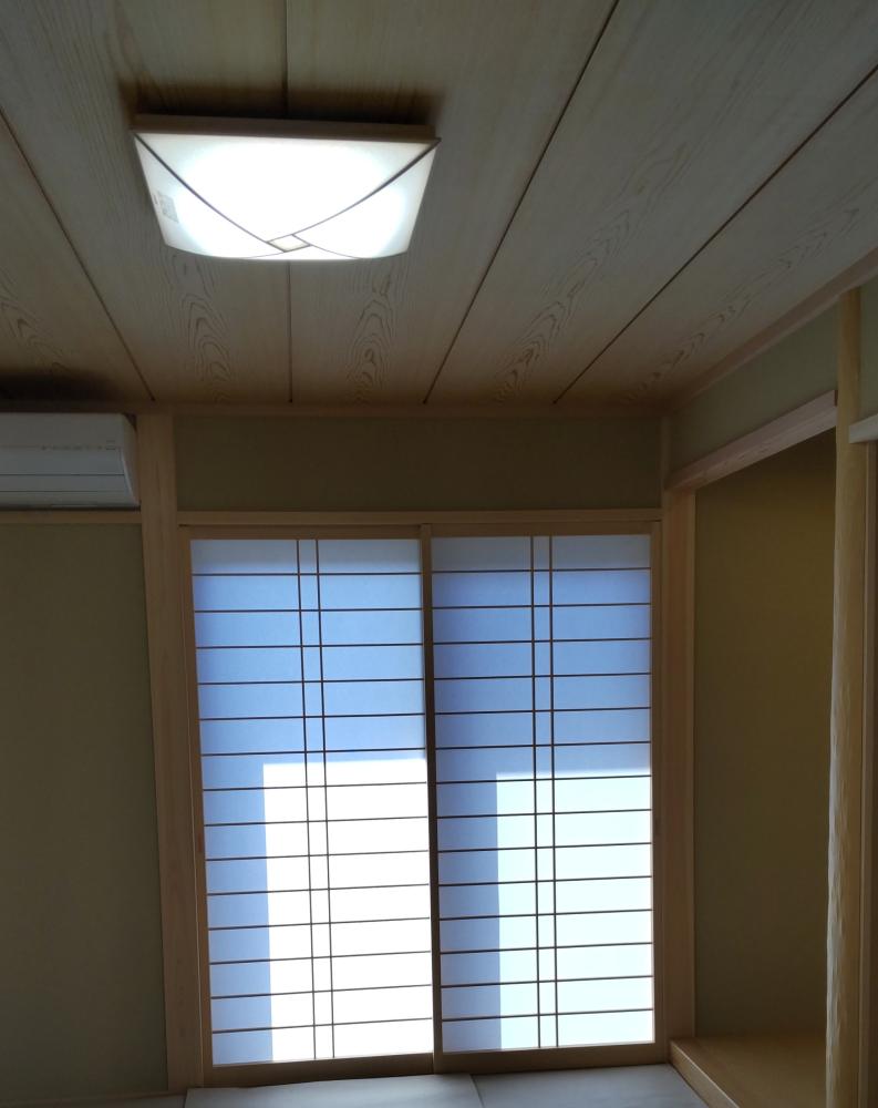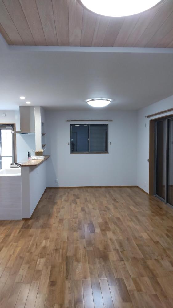 和風でモダン、シンプルですっきりしたデザインのお家です。床材はオークの雰囲気があふれ、天井の一部にはヒノキ羽目板が貼ってあります。和室は伝統的なスタイルで絵柄の入った襖になってます。
