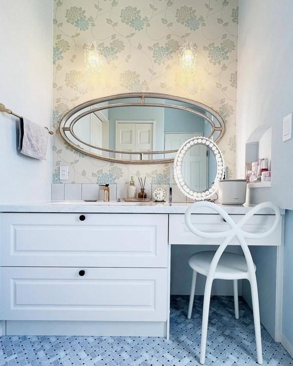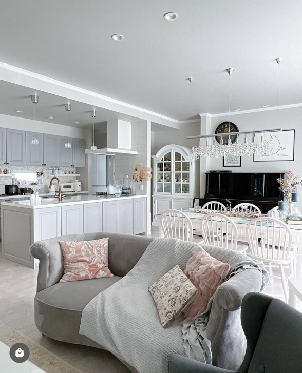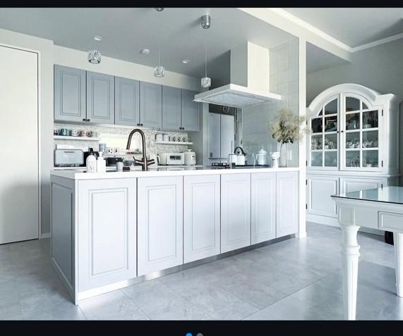 フレンチ・エレガントスタイルの邸宅。住友不動産ハウジングオリジナルキッチンや洗面と、お手持ちの家具とを融合したインテリア。タイルやモールディングにも拘った一邸です。