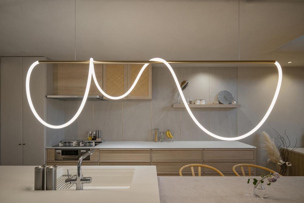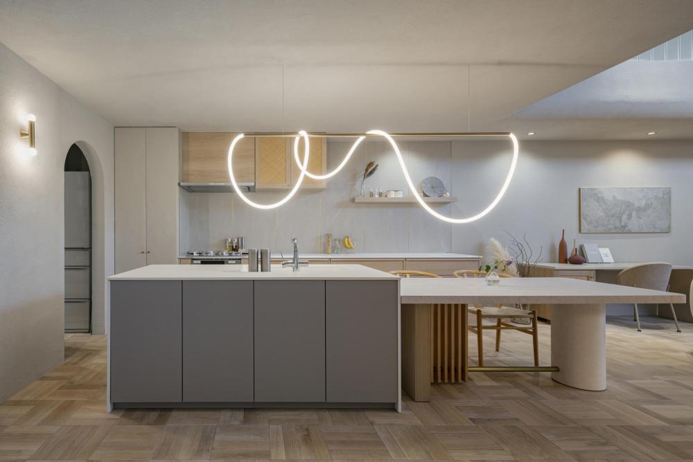 他にはない美しさを求めて、壁や天井、階段にまで曲線を設えた一級建築士の自邸。室内を包むアールの塗り壁は、時間とともに変化する光と影をやさしく受け止め、幾何学模様のパーケットフロアが落ち着いた重厚感を添える。室内扉の一部には、ラタン素材をあしらい、空間にプリミティブな軽やかさをプラス。曲線と素材が柔らかく調和し、日々の何気ない瞬間さえ美しい風景となる邸宅が完成した。