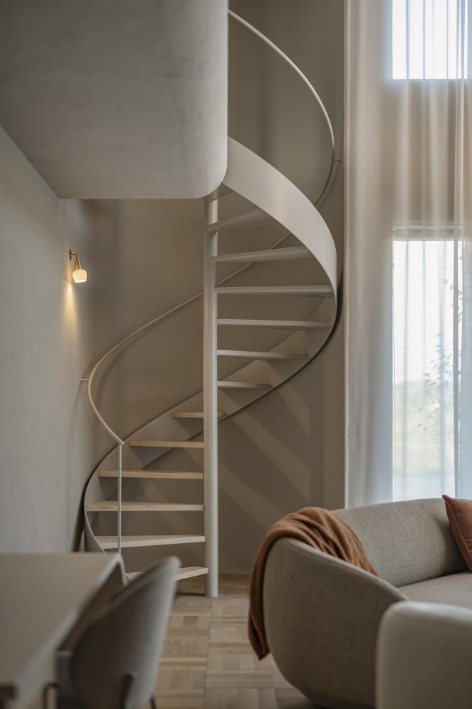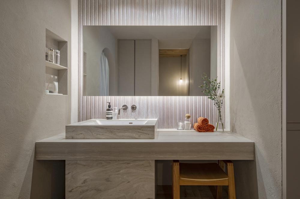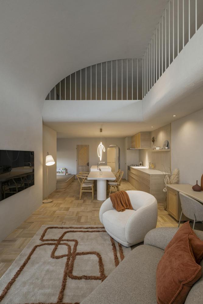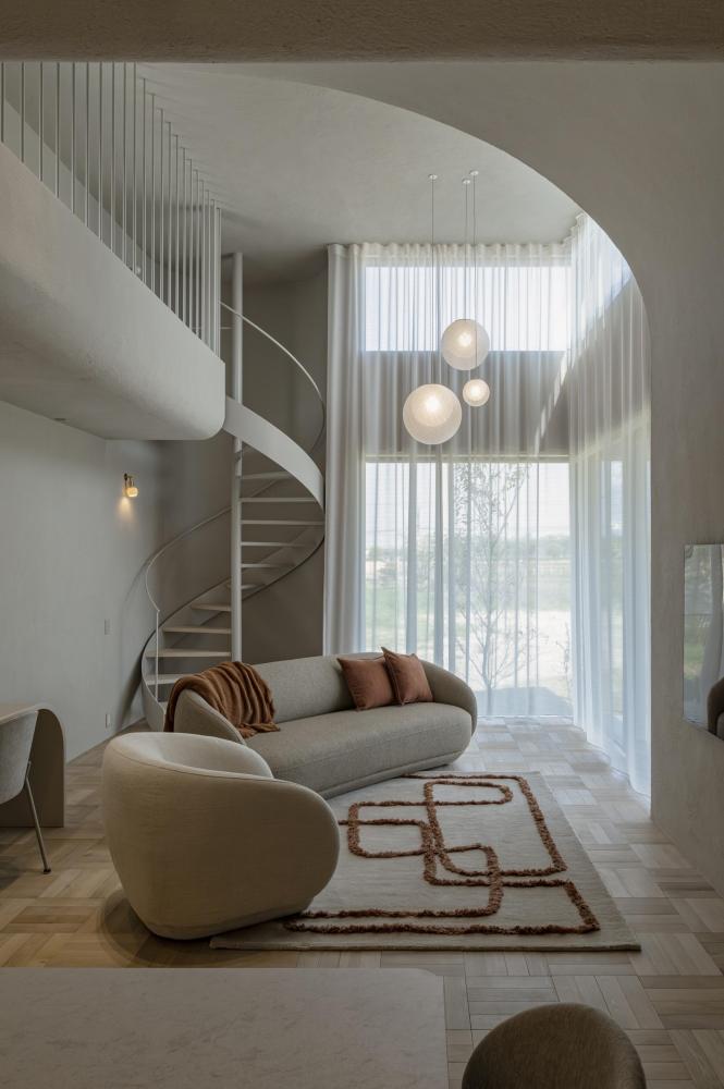 丸みのあるフォルムをとことん生かした、有機的なインテリアを叶えたお家が完成。「Rをふんだんに使った住まい」をテーマに設計した。玄関から美しいRを描く框や玄関収納が出迎えてくれ、LDKにはロフトへ誘うらせん階段も。個室に続く廊下は洞窟のような趣で、住まいとは思えないほどの非日常感に。「他では見たことのないデザイン」というご要望から、海外のデザインにも着目して提案。Rの世界観を統一するために、壁や天井を厚めの塗り壁材で仕上げ、家具を造作したりと細部まで徹底し、上品で可愛らしさもにじむ住まいが完成した。東と南に開けた土地を読み解き、東側に大開口を切り取って家の中から眺望を楽しめるように工夫した。LDKの前に中庭風のグランピングスペースを設けて、プライベートな庭時間が叶うのもポイント。水回りとウォークインクロゼットを1ゾーンに集約した回遊できる間取りを設計。柔らかなR(曲線)に包まれた癒しのお家になった。