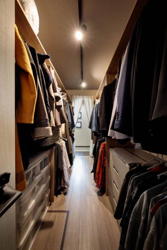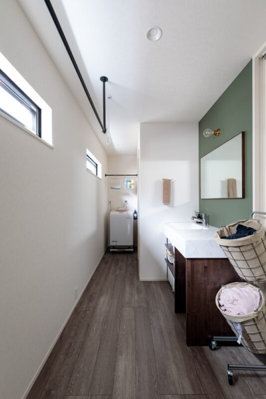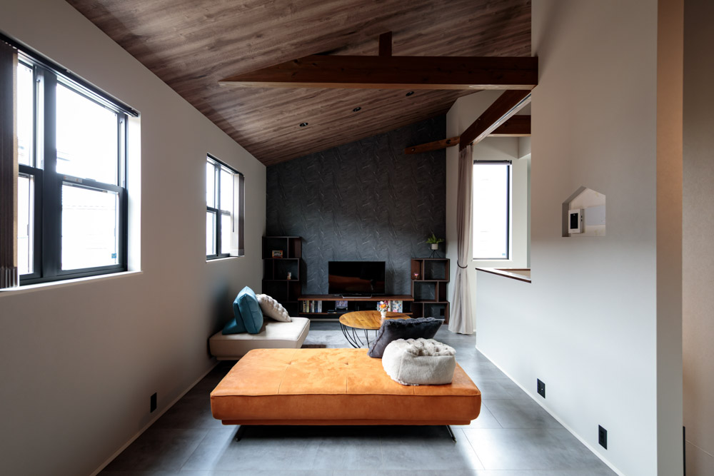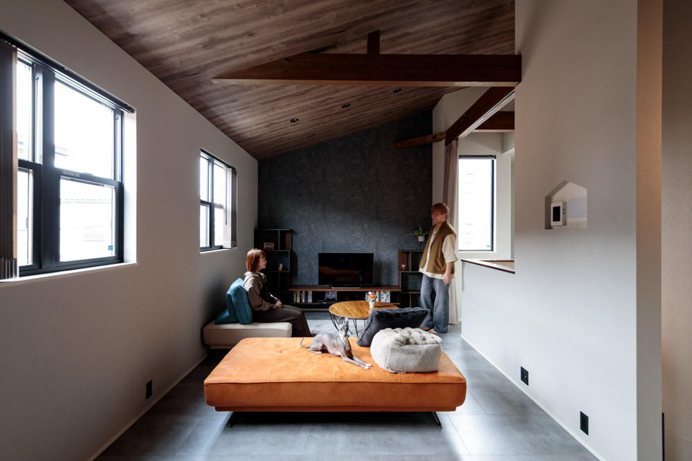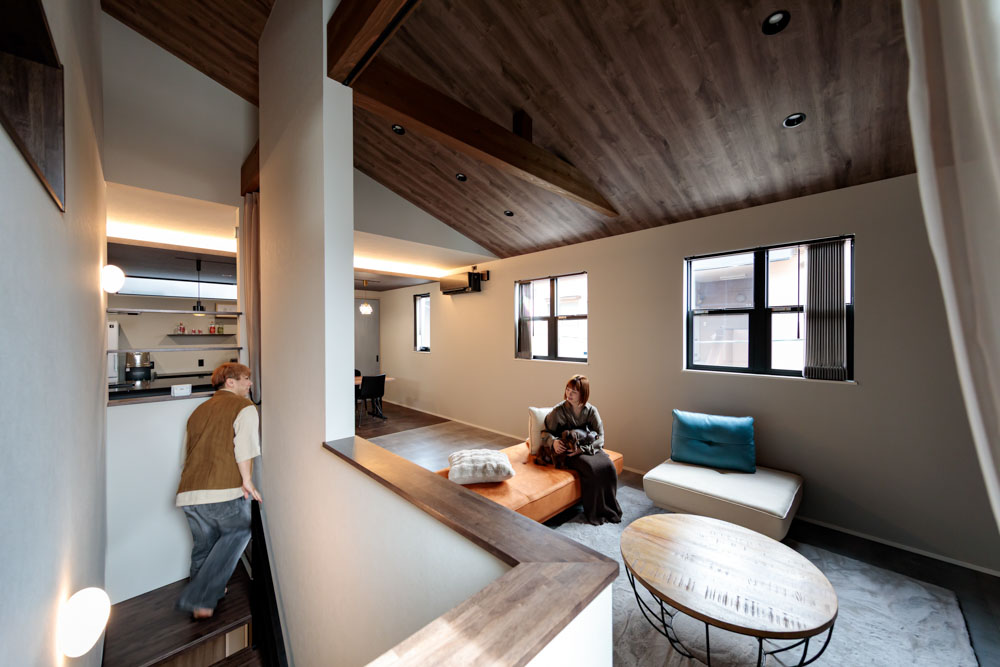 「家族を近くに感じられる、壁や仕切りのない家が理想だったんです」。そんなおふたりのお住まいは、寝室や水回りを1階に集約し、2階にLDKを配置した大らかな間取りが特徴。