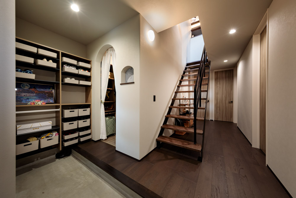 #2階リビング #アーチ壁 #アクセントクロス #スケルトン階段 #ニッチ #ペニンシュラキッチン #下がり天井 #勾配天井 #洗面台 #照明 #見せ梁天井 #趣味部屋