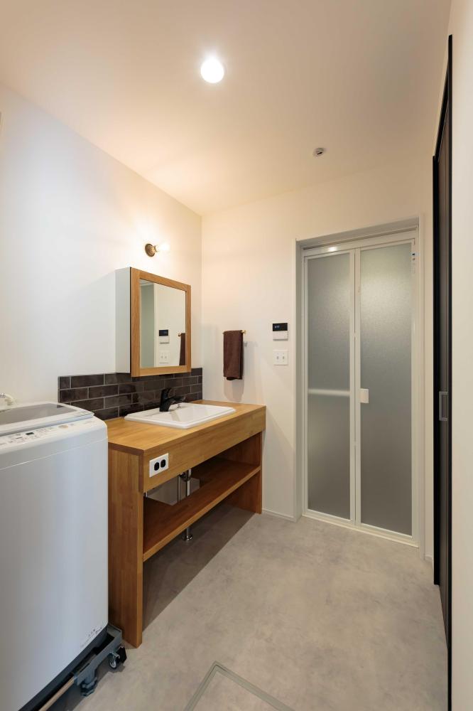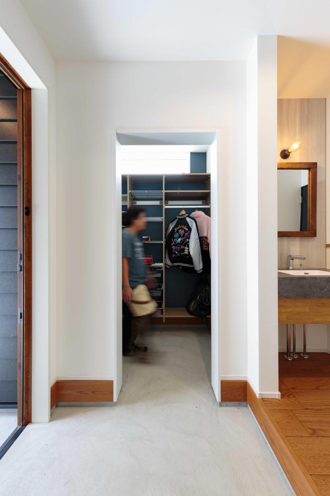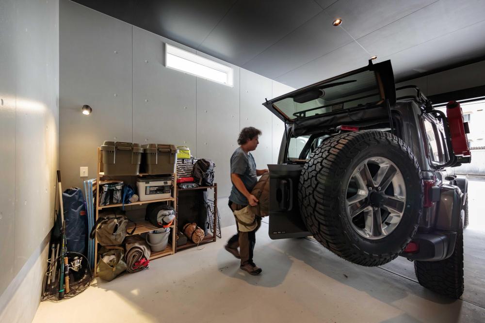 幅3.64m×奥行6.14m(約22平米) のビルトインガレージ。玄関と繋がるこの場所は、大切な愛車をお手入れするための広さも十分です。 設計の段階ではOSB合板貼りやカウンターなどの設置も検討されていましたが、最終的に決まったのはコンクリート打ちっぱなしをイメージした仕上がり。憧れのガレージを目指しながら楽しんでデザインいただけました。