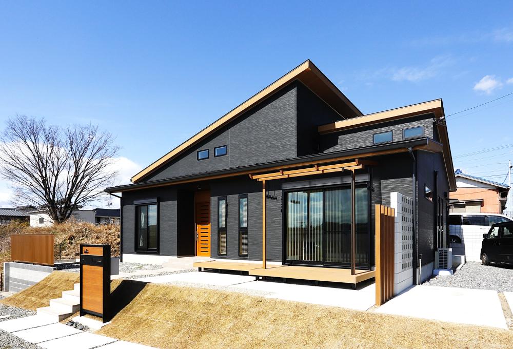 平屋建てながら大きく見える外観にこだわり、屋根の流れ方向にもこだわった外観。
