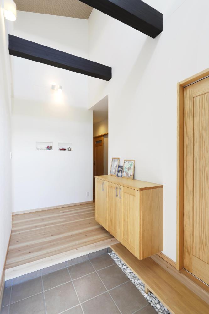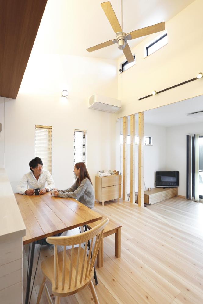 室内はリビングはサンクンフロアー、ダイニングは勾配天井の高さを設け広がりあるLDKにしました。