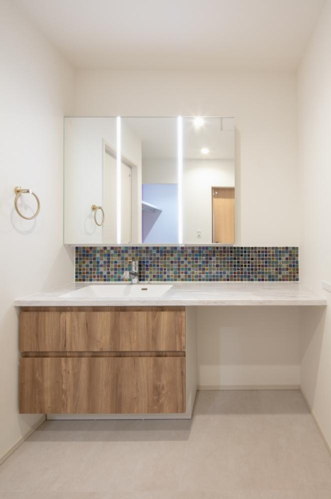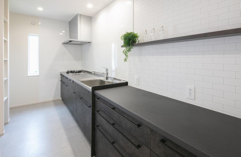 キッチンを壁付けにしてリビングを広く見せる工夫にしました。