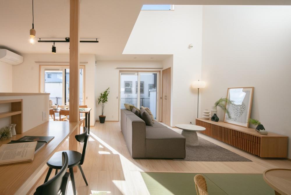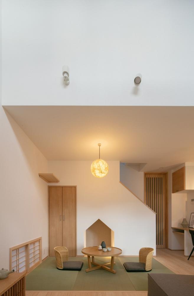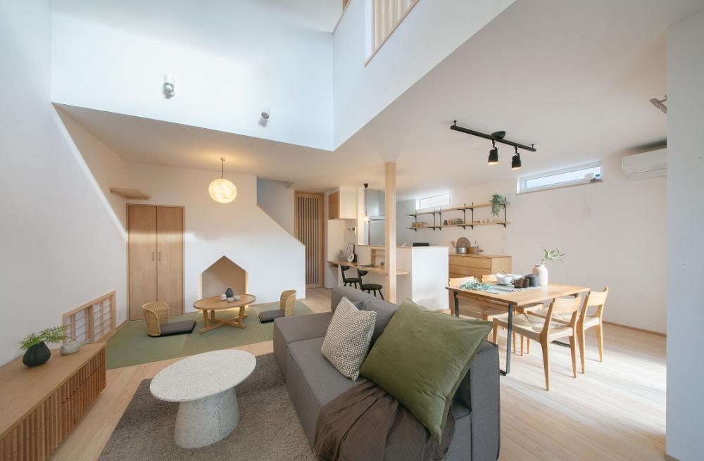 吹き抜け、畳コーナー、カウンター付きのキッチン、ランドリールーム、ウォークインクローゼット、1階寝室。