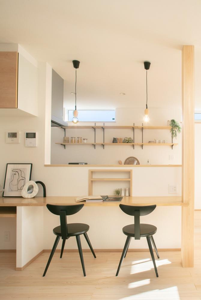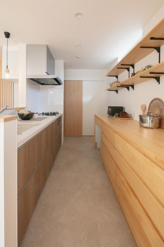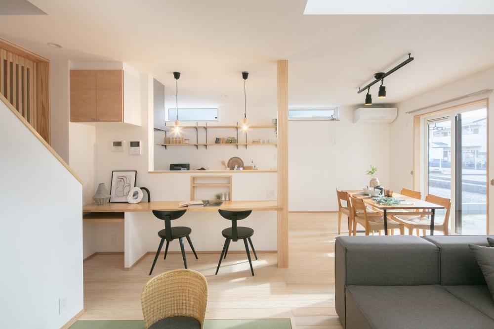 1階で完結する間取りにヒノキの無垢床・化粧柱・扉などで木の香る家に。