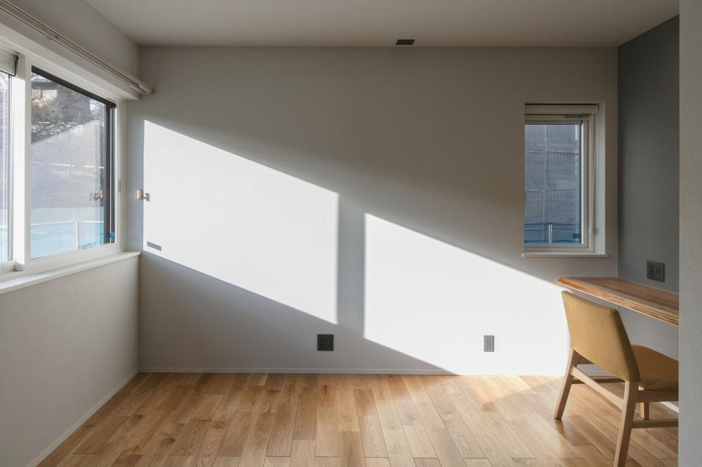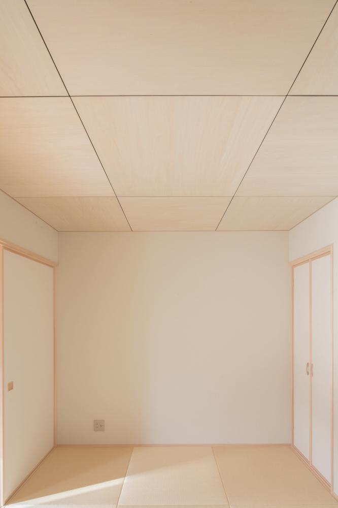 この住まいの特徴は、まず木質感を大切にした勾配天井と梁組が印象的で、室内にやわらかな陰影と温もりを生み出していることです。猫が自由に行き来できるように設けた小さな扉は、遊び心と暮らしやすさを両立させています。南向きの書斎は自然光がたっぷり差し込み、明るく落ち着いた空間になっているため、集中して過ごせる場所になっています。さらに、ベージュ色の琉球畳とシナ合板を組み合わせた和室は、伝統的な素材を用いながらも現代的でやさしい雰囲気を醸し出し、心から安らげる空間となっています。