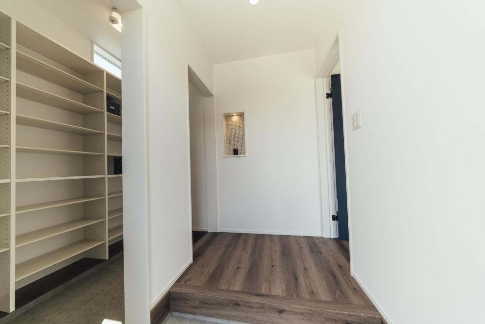 土足のまま出入りできる玄関クロークやウォークインクローゼット、大型の廊下収納など、収納スペースも適所にたっぷりと設けられている。