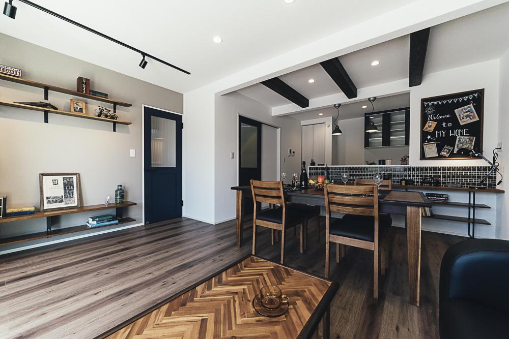 #TVボード #アクセントクロス #アメリカンスタイル #ヴィンテージ #ヘリンボーン #収納棚 #対面キッチン #見せ梁天井