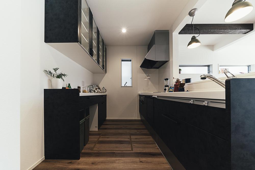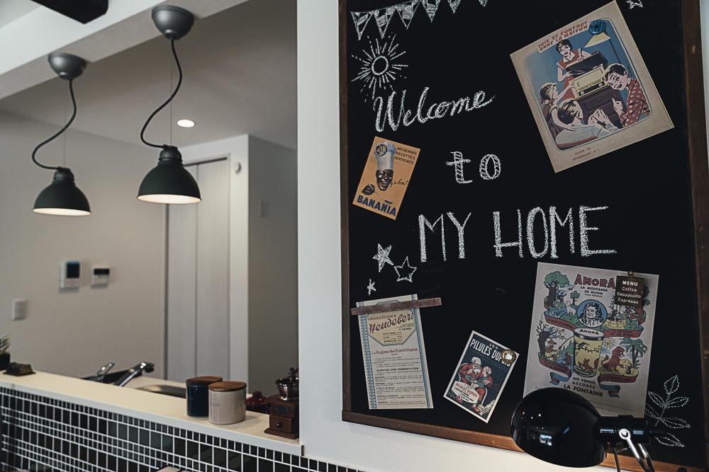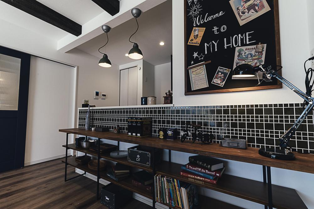 飾り棚やカウンターなどは造作で、ポイントにタイルや黒板を使うなど、さまざまなこだわりが叶えられている。