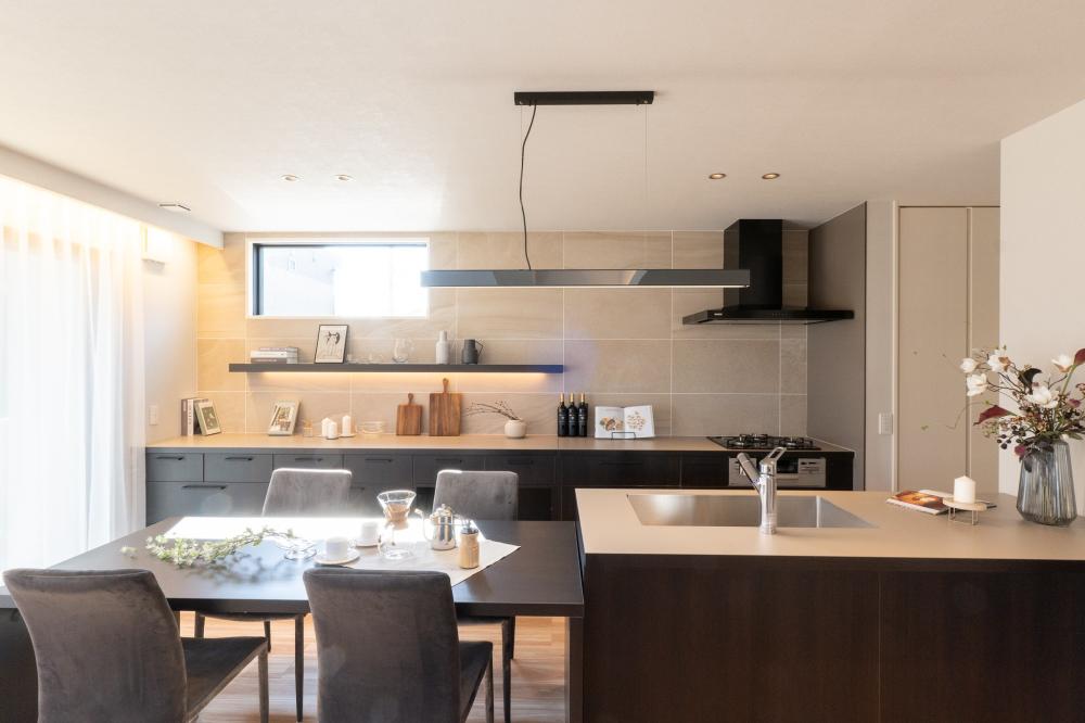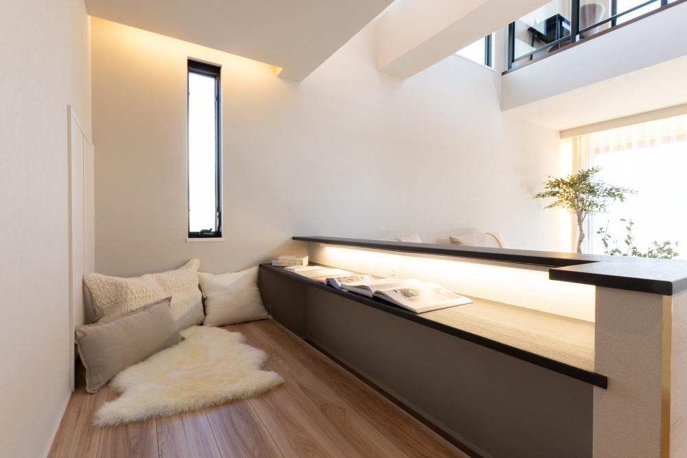 #ホテルライク , #吹抜け , #Ⅱ型キッチン , #小上がり , #回遊導線 , #間接照明 , #在宅スペース , #家事室 , #タイルデッキ , #AICA工業 , #造作洗面 , #デザイン住宅 , #鉄骨 , #全館空調 , #トヨタホーム , #大空間