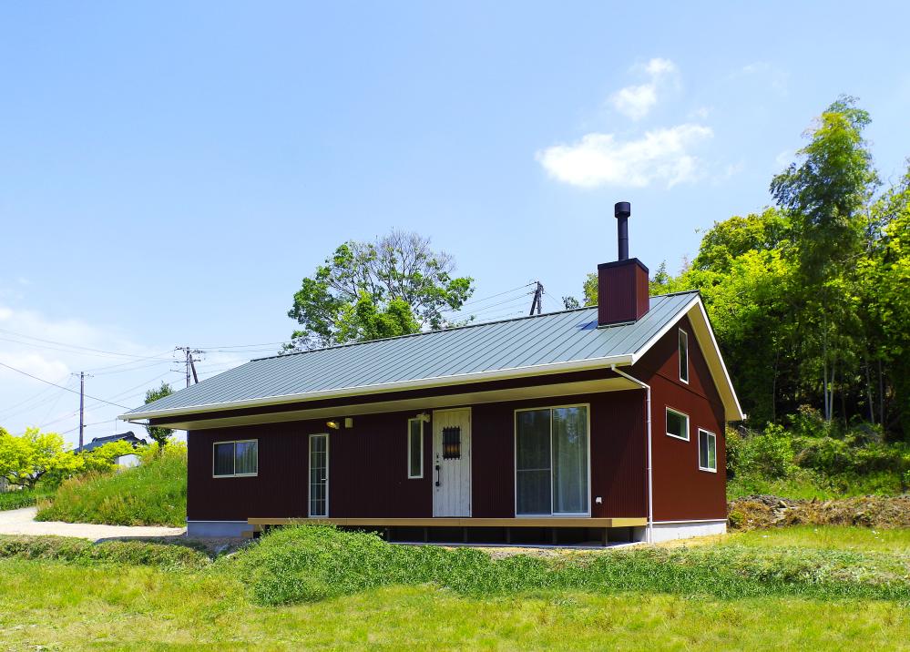 薪ストーブのある赤い平屋の家