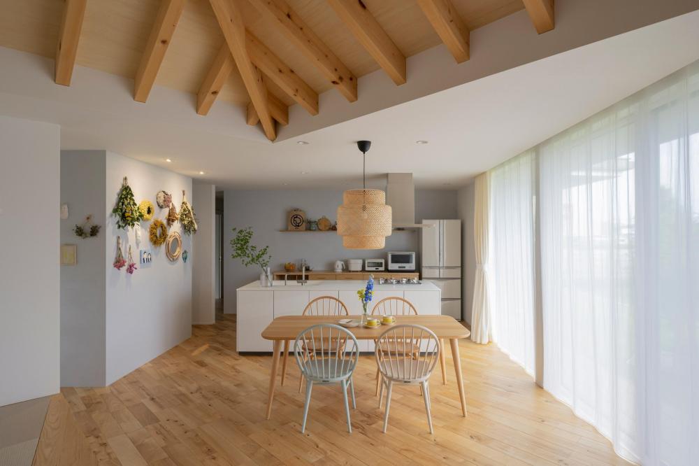 大人な北欧の雰囲気漂う本巣市の平屋。 「平屋が建てられる」「南側が開けている」という条件をもとに一緒にお土地を探すところからスタートした。 外観は、見え方に変化をつけるため道路に対して45°の角度で設計。 斜めにすることで、前面道路からのプライバシーも確保した。 室内はお好きな雰囲気の写真をたくさん共有いただき、その中の共通点である「淡い色でまとめた明るい空間」と、「梁がある勾配天井」を採用。 北欧テイストのやわらかい雰囲気でまとめつつも、可愛すぎないキレイさを持ち合わせた平屋が完成した。