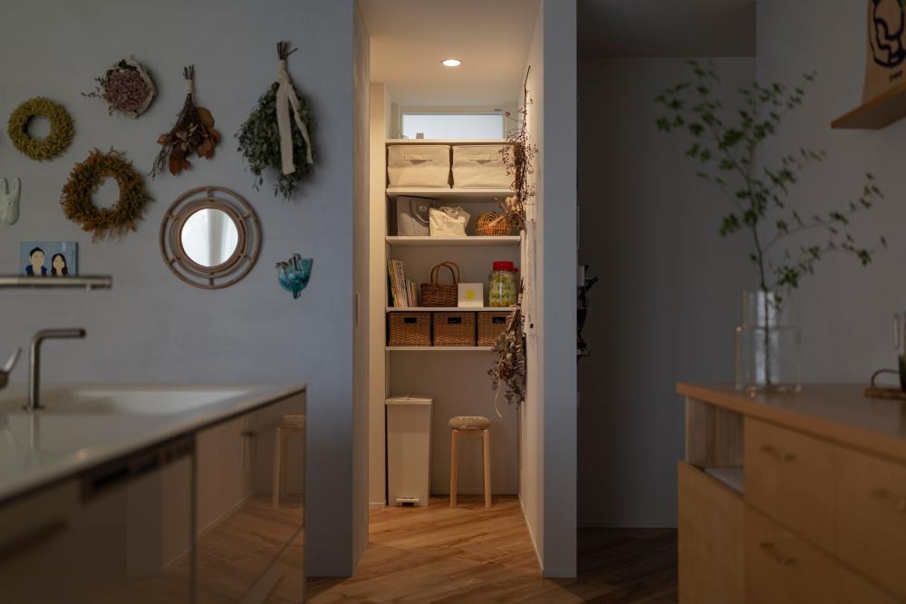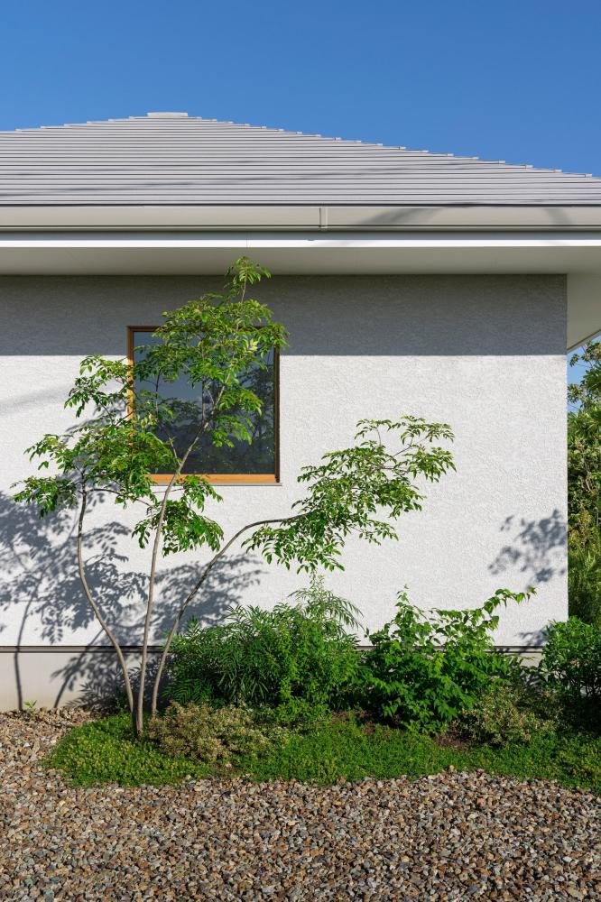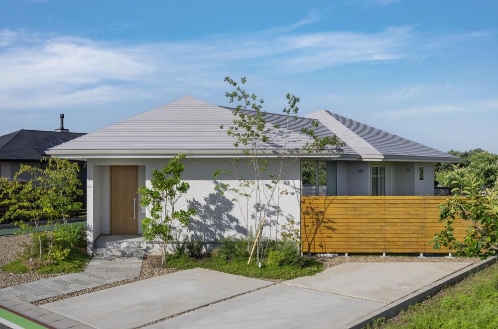 「穏やかな環境で平屋暮らしを楽しみたい」と考えていたNさんは、グランハウスの設計士と土地条件から考えることに。南面が開けて西側に道路がある100坪以上の土地が見つかり、設計士が描き出したのは「への字の平屋」。西側道路に対して45度に曲げて配置することで、視線や西日を遮りやすく、道路側におしゃれな四角のフォルムを見せることができる。この「への字」の外観を生かして、スムーズな家事動線を考えていった。プラモデル作りが趣味のNさん夫は、趣味室も譲れないこだわり。趣味室の理想を優先したところ「家の中央に洗面室」という間取りになったが、天窓から光が差し込む洗面室は「明るくて、視線も気にならない」という新たな魅力があったそう。インテリアはNさんが集めた画像から、「淡いトーンでまとめて、雑貨やクッションで差し色を楽しむ」「木を見せる勾配天井」という共通項が見つかり採用。白をベースに淡いグレーのペイント壁を効かせて、“家具や雑貨で遊べる余韻”のある空間が叶った。置き家具のようにデザインされた造作も美しく、大人のスカンジナビアンスタイルが見事に完成。Nさんは庭の家庭菜園で育てた野菜を使って料理を楽しみ、洗濯は1ゾーンでスイスイ完結という豊かな暮らしを満喫しているそう。