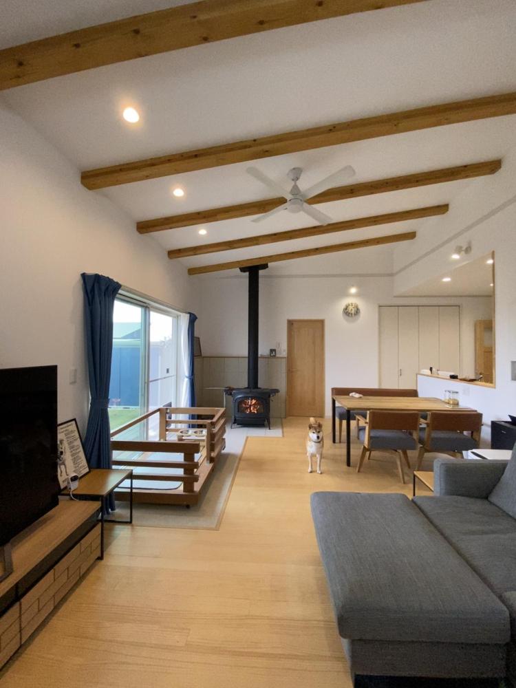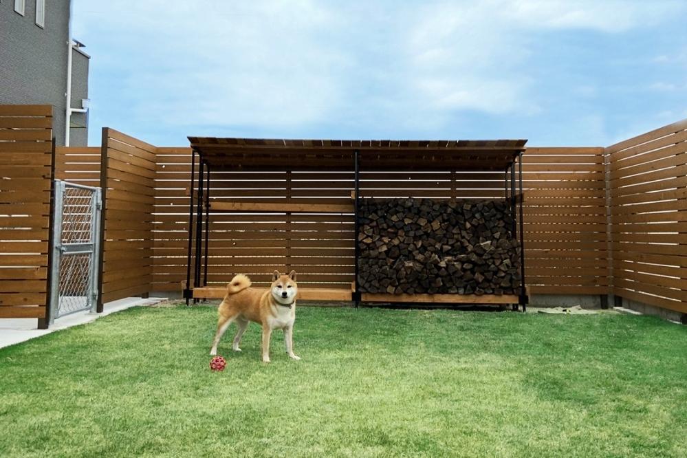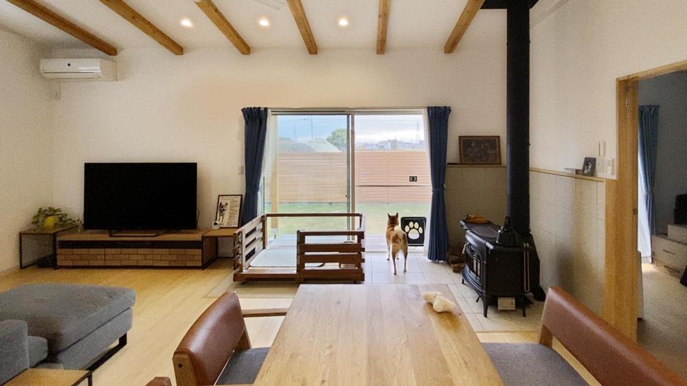 #ウッドデッキ #タイル #ドッグラン #勾配天井 #平屋 #目隠し #薪ストーブ #見せ梁天井