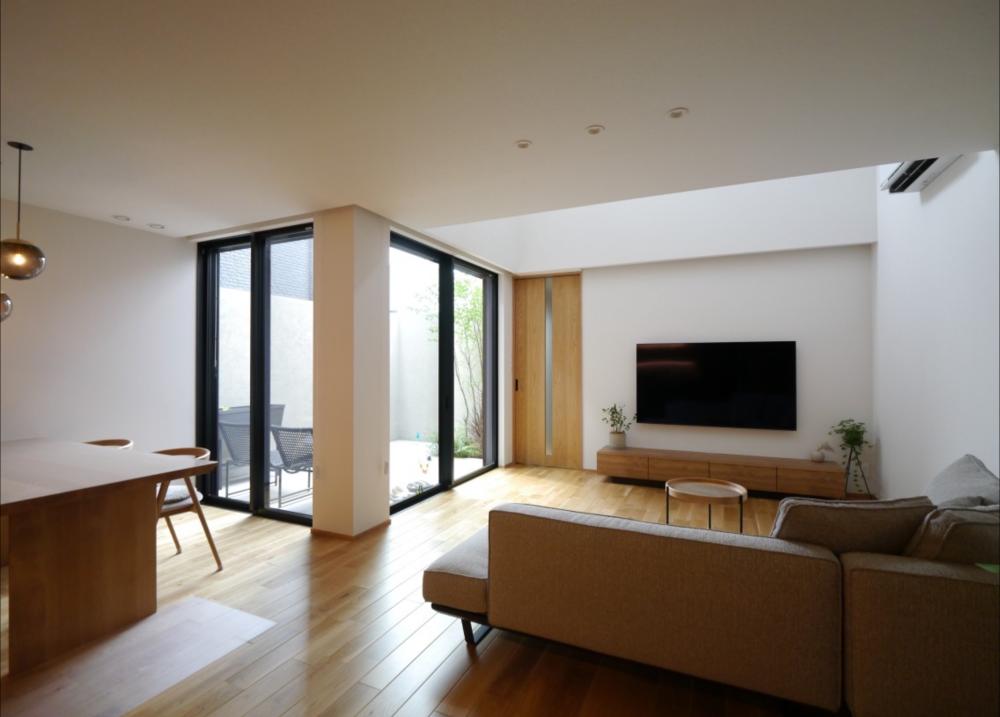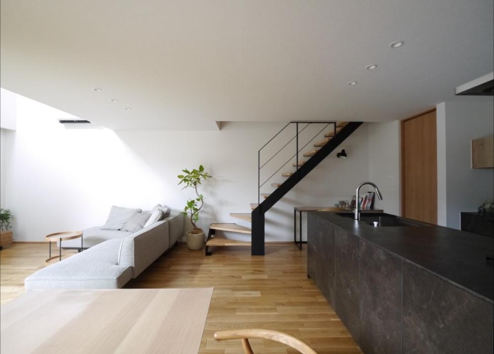 土地探しからのご計画でした。南側に大きなマンションがあり、採光やプライバシーを考えながら計画しました。外観や内装は明るくカジュアルなテイストです。リビングには吹き抜けがあり、階段はオープン階段で開放感があります。またリビングと繋がるテラスがあり、リビングとの一体感で坪数以上に広さを感じられる設計になっています。